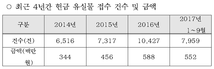 서울교통공사(사장 김태호)는 2014년부터 2016년까지 최근 3년간 서울 지하철 1~8호선에서 접수된 현금 유실물이 총 24,260건 13억 8천만 원에 이르며 접수된 현금 유실물은 건수를 기준으로 85%가 주인에게 인도된 것으로 나타났다. 주인이 나타나지 않아 경찰로 넘어간 돈은 1억 3천만 원이다. 1~8호선의 전체 유실물 건수 중 현금 유실물이 차지하는 비중은 7% 수준이지만 최근 3년간 건수와 금액은 늘어나는 추세다. 현금 유실물 발생 건수는 2014년 6,516건에서 2015년 7,317건, 2016년 10,427건으로 증가했고 금액도 2014년 3억 4천만 원에서 지난해에는 5억 8천만 원으로 1.7배 늘었다.