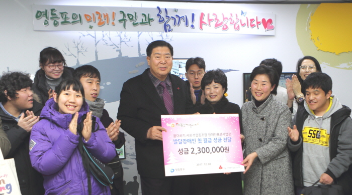 우리도 나눔문화 확산에 기여했어요! 8일 오후 꿈더하기 사회적협동조합 장애인표준사업장에서 근로하고 있는 발달장애인 김선교(25, 남) 등 10명은 첫 월급의 50%씩 모아 총 230만원을 ‘2018 희망온돌 따뜻한 겨울나기’ 성금으로 영등포구에 전달했다.