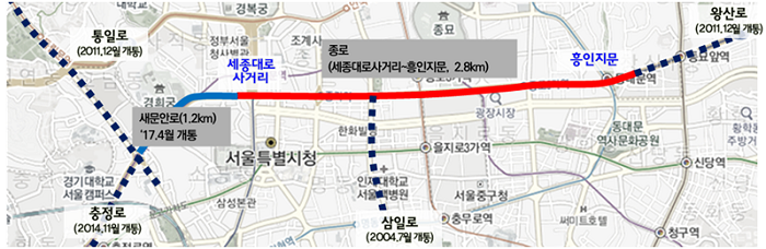 종로 중앙버스전용차로 개통으로 서울 도심의 대중교통 이용편의가 증대되는 동시에, 서울 도심을 동-서(경인‧마포로~망우‧왕산로)로 관통하는 중앙버스전용차로 동서축이 완성된다. 12월 31(일) 첫차 운행부터 종로(세종대로 사거리~흥인지문 교차로 구간 2.8km) 중앙버스전용차로가 개통된다.