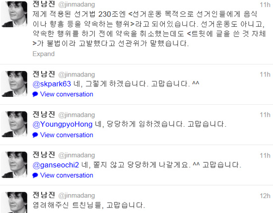 강원도 선관위.."SNS상 특정후보자를 위해 투표하도록 금품 등..." 강원도선거관리위원회는 16일 SNS상에서 특정 후보자를 위해 투표하면 커피를 쏘겠다는 글을 올린 북카페 사장을 고발조치 했다고 밝혔다. 선관위는 이날 보도자료 등을 통해 "제18대 대통령선거와 관련하여 ’2012. 9. 21.부터 12. 11.까지 자신의 트위터에 정권이 교체되거나 A후보자가 대통령이 되면 커피를 무료로 제공하겠다는 등의 글을 13회에 걸쳐 트윗함으로써 선거인인 자신의 팔로워 17,581명에게 음식물을 제공하겠다는 의사표시를 공표한 B를 공직선거법 위반혐의로 2012. 12. 14.자 춘천지방검찰청강릉지청에 고발하였다"고 밝혔다. 선관위는 "B(46세, 남)씨는 △△당 당원이고, 관광도시인 강릉에서 커피 전문점을 경영하는 자로서 자신의 트위터에 무소속 예비후보자가 사퇴하기 전까지는 본인이 지지하는 A후보자 이외의 다른 후보자 또는 정당을 비판하거나 비난하는 글을 트윗 하였고, 그 이후로는 자신이 지지하는 후보자의 당선을 위해 선거인으로 하여금 투표를 하게 할 목적으로 A가 대통령으로 당선되면 커피를 무료로 제공하겠다는 등의 글을 13회에 걸쳐 트윗한 사실이 있다"는 것. 이와 관련 "선관위는 공직선거법」제230조(매수 및 이해유도죄)제1항제1호에 의하면 투표를 하게 하거나 하지 아니하게 하거나 당선되거나 되게 하거나 되지 못하게 할 목적으로 선거인 등에게 금전·물품·차마·향응 그 밖에 재산상의 이익이나 공사의 직을 제공하거나 그 제공의 의사를 표시하거나 그 제공을 약속한 자는 5년 이하의 징역 또는 1천만원이하의 벌금에 처하도록 규정하고 있는데, B의 경우와 같이 트위터 등 SNS상에서의 제공 의사표시도 예외가 될 수 없으며 이는 중대한 선거범죄"라고 강조했다. 또한, "B씨의 트위터 계정 팔로워가 17,581명으로 그 수가 매우 많고 트위터의 특성상 팔로워가 리트윗 하는 점을 감안해 볼 때 동 내용을 리트윗 하는 경우 A후보자에 대한 투표효과가 결코 작다 아니할 수 없으며, 선거에 미치는 영향이 크다는 점과 유사 사례 방지를 위하여 불가피하게 엄중히 고발 조치하였다"고 설명했다. 전남진 시인 ...선관위의 겁박 선관위에 의해 검찰에 고발된 북카페 사장은 전남진 시인으로 확인되었다. 전 시인은 이날 오후 자신의 트위터에 올린 글을 통해 "제게 적용된 선거법 230조엔 <선거운동 목적으로 선거인들에게 음식이나 향흥 등을 약속하는 행위>라고 되어있습니다. 선거운동도 아니고, 약속한 행위를 하기 전에 약속을 취소했는데도 <트윗에 글을 쓴 것 자체>가 불법이라 고발했다고 선관위가 말했습니다."고 주장했다. 전 시인은 계속해서 "커피 쏜다는 약속 취소 했는데, 결국 선관위가 저를 고발했군요. 왜 이렇게 국민을 겁박하는 걸까요?"라며 반발했다. 전 시인은 또한 "선관위...공정한 선거가 되도록 양심껏 해주시길 바랍니다. 권력부터 법을 지켜야 합니다. 윗물이 맑아야 아랫물도 맑다는 말을 실천해주세요. 법은 통치 수단이 아닙니다. 누구나 지켜야 하는 것이죠. 특히 권력은 준법해야 합니다."며 자신에 대한 고발이 부당함을 지적했다. 한편 전 시인의 트위터에 대해 선관위는 12월 12일 현재 "등록사용자 순위는 총 9,119명중 1,637위이며 작가/출판사 51위, 시인 7위에 각각 랭크되어 있다."고 밝혔다.