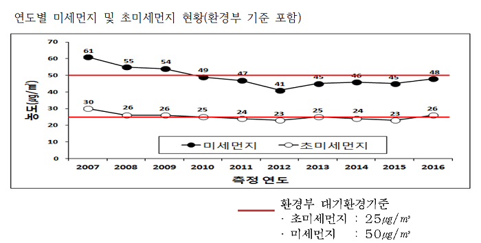 서울시는 매년 대기 질 개선사업에 매년 큰 폭으로 예산을 증액하여 투입한 결과 서울시의 미세먼지와 초미세먼지 농도는 2007년부터 2012년까지는 감소 추세였다. 그러나 2013년부터 감소가 정체되거나 조금씩 다시 늘어나고 있다.