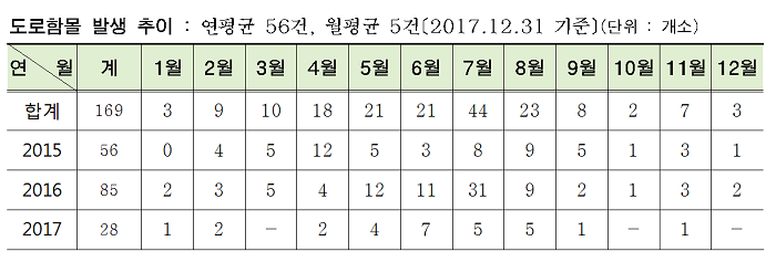 첨단 탐사장비를 통해 지난해 말까지 서울시 주요 간선도로를 탐사한 결과 도로함몰의 전제가 되는 동공은 2504개가 발견됐고, 탐사구간 도로에는 1차로 기준으로 2㎞당 1개의 동공이 있는 것으로 나타났다. 국내 업체의 동공탐사는 '15년에 처음 착수해 시행착오를 겪은 다음 '16년 상반기부터 본격적인 탐사가 시행됐고, 발견된 동공을 집중적으로 복구한 하반기 이후 '17년엔 도로함몰이 전년대비 67% 가까이 감소하여(‘16년 85건 → ’17년 28건) 장래에 함몰로 이어질 동공을 사전에 복구한 효과가 나타난 것으로 분석되었다. 지난 3년간 서울시 도로지반을 탐사한 결과 땅 밑에 숨은 동공의 분포밀도는 지하매설물이 복잡하고 오래된 도로, 지하철이 건설된 도로에서 높게 나타났고, 지하 매설물이 적은 시 외곽 순으로 적게 나타났다. 도로함몰 발생 원인별로는 하수도 50%, 굴착복구 미흡 38%, 상수도 12%씩 각각 나타나 서울시는 도로함몰 원인의 근원적 예방을 위하여 노후취약 상·하수관 개량, 굴착복구 공사장 관리강화를 병행 추진하고 있다. 도로함몰에 취약한 노후 하수관은 정비에 대규모 예산이 수반됨에 따라 개량이 불가피한 노후·불량 하수관(약 308㎞)에 대해서는 '20년까지 4,596억원(국비지원 필요)을 투입, 개량 중이다. 따라서 시는 지하 노후시설의 개량이 장기간 진행되는 여건을 감안, 도로지반에 대한 동공탐사를 우선 시행하여 도로함몰 사고를 방지할 계획이다.