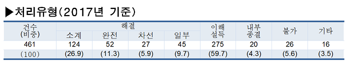 처리결과 유형에 따르면 민원내용을 소관부서에서 검토한 결과 예산·법령상 민원처리가 불가하여 민원인에게 양해를 구하거나 ‘이해 설득’ 한 경우가 275건(59.7%)으로 가장 많으며 민원을 ‘해결’ 한 경우는 124건(26.9%)으로 나타났다.