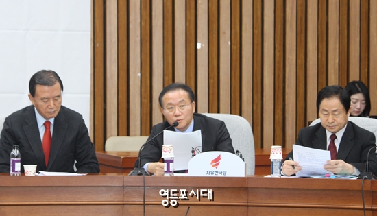 함진규 정책위의장(오른쪽 사진 가운데)은 교육부가 2020년부터 적용되는 중고등학교 역사교과서 집필기준에 자유민주주의에서 ‘자유’를 삭제한 것에 대해 강하게 비판했다.