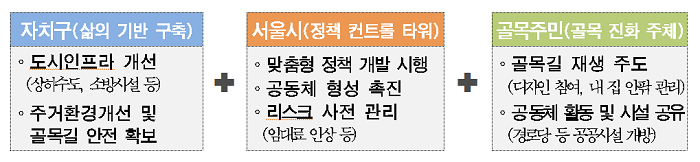 개발의 시대를 거치면서 대규모 아파트와 자동차 공간으로 자리를 내주며 사라졌지만 아직도 열악하고 낙후된 골목길이 많은 곳에 남아있다. 서울시가 도시의 역사와 함께해온 역사문화유산이자 삶의 공간인 골목길을 일‧삶‧놀이가 어우러진 곳으로 재생하는 ‘서울형 골목길 재생사업’을 올해부터 본격 추진한다고 8일 오전 밝혔다. ‘서울형 골목길 재생사업’의 핵심은 골목길의 ▲역사문화적 숨길을 보존하고 ▲낙후된 환경을 개선하며 ▲공동체를 되살리는 것이다. 즉 바닥이 파손되고 조명이 없어 어둡고 위험했던 골목길 주변 생활환경을 안전하고 쾌적하게 개선하고, 일부 폐가를 활용해 카페‧식당, 마당 등으로 조성해 골목 활성화와 일자리 공간으로 활용한다. 아울러, 주민 주도로 담장 낮추기, 골목 마당 공유, 내 집 수선하기 같은 사업도 함께 병행 추진 한다.