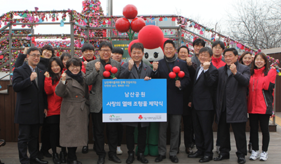 9일 오전, 서울의 상징이자 대표 관광지인 중구에 위치한 남산공원에서 서울 사회복지공동모금회(회장 윤영석, 이하 서울 사랑의열매)와 한국삭도공업(주)(대표 한광수, 이기선)이 함께 나눔의 상징인 사랑의열매 조형물 설치식을 진행했다.
