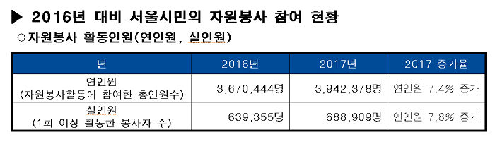 2017년 자원봉사 활동에 참여한 총 연인원은 3,942,378명으로 2016년 3,670,444명에 비해 7.4% 증가했으며 자원봉사 활동에 참여한 총인원 중 1회 이상 활동한 자원봉사자 실인원은 688,909명으로 20116년 639,355명에 비해 7.8% 증가하는 것으로 나타났다.