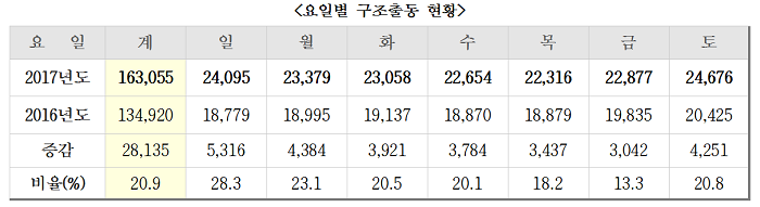 요일별로 살펴보면 토요일 24,676건>일요일 24,095건>월요일 23,379건 〉 목요일이 22,316건으로 가장 적었고, 15시~17시에 25,969건(16%)으로 구조요청이 가장 많았으며, 취침 시간대인 새벽 3시~5시에 16,275건으로 가장 적었다.