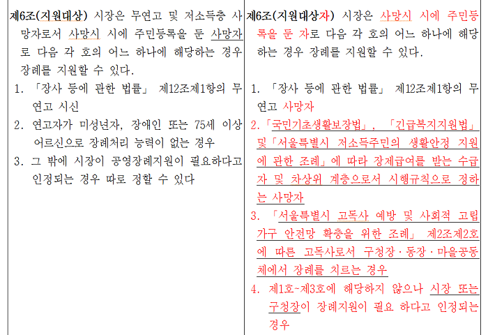 이번에 수정 가결된 조례안의 주요 내용을 살펴보면 지원대상자를 무연고 사망자뿐만 아니라 기초생활보장 수급자와 차상위계층을 모두 포함하도록 했다. 다만 기초생활보장 수급자 등에 대한 실태조사를 통하여 시장이 실효적으로 지원대상을 정할 수 있도록 명시했다.
