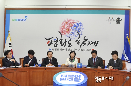 민주당 추미애 대표(사진 오른쪽에서 세 번째)는 2일 국회에서 최고위원회의를 열고 “99년 전 3월 1일”을 되새기고 “한반도 대평화의 시대를 열어가야 한다”고 강조했다.