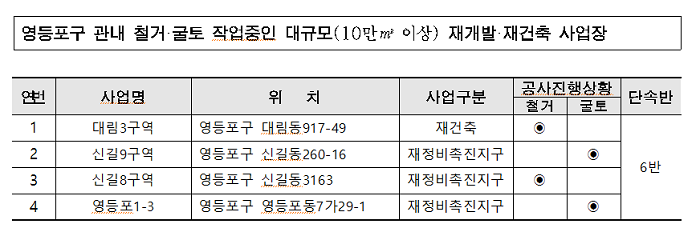 영등포구 관내 철거·굴토 작업 중인 10만㎡ 이상 대규모 재개발·재건축 사업장은 현재 철거 중인 대림3구역 영등포구 대림동 917-49, 신길8구역 영등포구 신길동 3163 재정비촉진지 재정비촉진지구와 굴토작업 중인 신길9구역 영등포구 신길동 260-16, 영등포1-3 영등포구 영등포동7가29-1 재정비촉진지구 등 4곳이다. 서울시와 자치구에서는 오염원에 대한 원인자 부담원칙에 따라 3월부터 비산먼지 발생사업장에 대해 단속반을 구성하여 철거‧굴토작업이 진행 중인 대규모 재개발‧재건축 사업장 31개소, 자치구는 관내 1만㎡ 이상 대형사업장 460개소에 대해 집중적으로 점검한다. 즉 1만㎡ 이상 대형사업장 491개소가 이번 집중단속의 대상이다. 주요 점검‧단속사항은 ▲대형공사장 야적토사 및 비포장면 덮개 설치, 훼손 부분 원상복구 여부 ▲토사 운반차량 과적 및 세륜·세차시설 설치·가동 여부 ▲주변도로와 나대지, 공터의 청소 상태 등이다. 점검 결과 위반사항이 적발 때 경고, 조치이행 명령, 공사 중지 등 행정조치를 추진하고, 위반정도가 심할 경우 300만 원 이하의 벌금을 부과할 계획이다. 적발된 사업장은 향후 재점검을 실시하여 조치여부가 제대로 이행되었는지 여부를 재확인할 예정이다. 아울러, 점검·단속 결과를 토대로 비산먼지가 많이 발생한 사업장 주변에 대해 물청소를 실시하는 등 후속 조치할 계획이다.