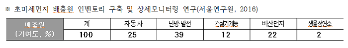 초미세먼지 배출원 인벤토리 구축 및 상세모니터링 연구(서울연구원, 2016년)의 발표에 따르면 초미세먼지 배출 기여도는 난방·발전이 가장 높은 것으로 나타났다. 그 뒤를 자동차, 비산먼지, 건설기계, 생물 성 연소 등이 그 뒤를 이었다.