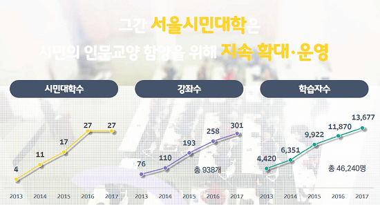 서울시는 올해부터 ‘서울시민대학’이란 평생교육 학습장 명칭을 ‘서울자유시민대학’(총장: 서울시장)으로 변경하고, 대학과 민간교육기관 등 민관협력으로 오는 ’22년 서울자유시민대학 100개 캠퍼스 시대를 열겠다고 밝혔다. 「서울자유시민대학 2022 운영계획」에 5년 간 총 335억 원을 투입한다. 운영 실무는 서울시평생교육진흥원이 담당한다. 서울시는 2013년 도심권인 시민청에 ‘서울시민대학’이라는 이름의 1호 평생교육 학습장을 열었다. 이후 권역별 캠퍼스('14년 서북권, '16년 동남권‧동북권, '17년 서남권)가 차례로 문을 열면서 5개 권역별 거점 교육공간이 완성됐다. 28개 대학에서도 특성화 분야를 살린 ‘대학연계 시민대학 캠퍼스’가 활발히 운영되는 등 지금까지 33개 교육공간이 생겼다. 그동안('13.~'17.) 총 938개 강좌를 총 46,240명이 수강했다. 올해는 서울 전역에 퍼져있는 시민대학 캠퍼스들의 컨트롤타워 역할을 할 ‘본부 캠퍼스’(종로구 송월길 52)가 종로구 옛 서울시복지재단 자리에 문을 열었다. 서울시는 10일(화) 14시 박원순 시장과 시민 100여 명이 참석한 가운데 개관식을 개최한다. 올 한 해 본부캠퍼스를 비롯해 5개 권역별캠퍼스, 대학연계 시민대학 캠퍼스 등 총 34개 캠퍼스에서 432개 강좌가 개설‧운영될 예정이다. 젠더, 4차 산업혁명, 미세먼지 등 실생활과 밀접하고 미래 대응력을 높이는 강좌가 새롭게 신설되고, 배우고 싶지만 무엇을 배워야 할지조차 막막한 사람들에게 상담을 해줄 ‘학습매니저’도 배치된다. 「서울자유시민대학 2022 운영계획」의 5대 핵심과제는 ①‘명예 시민학위제’ 도입 및 명예시민학‧석‧박사 3천 명 배출 ②‘본부캠퍼스’ 본격 운영 ③민관협력 중심으로 ‘서울자유시민대학’ 100개소로 확대 ④교육분야 확대 개편(4개→7개) 및 품질 강화 지원 ⑤빅데이터 활용 학습이력 ‘통합관리시스템’ 가동이다. 한편, 서울시는 서울자유시민대학을 세계적인 수준으로 끌어올리기 위해 국내외 시민대학이 참여하는 ‘글로벌 시민대학 네트워킹 컨퍼런스’를 내년부터 격년으로 개최하고, 독일 뮌헨 등 시민대학을 선도하는 세계 도시들과 협의체 구성을 추진해 다양한 협력사업도 모색할 계획이다. 박원순 시장은 “배우고 있는 한, 당신은 늙지 않는다”는 노벨수상자인 미국의 물리학자 로잘리 얄로의 말을 인용하며 “서울자유시민대학은 서울시민의 삶, 꿈, 미래와 함께하는 모두의 대학”이라고 강조했다. 박 시장은 이어 “위대한 도시는 위대한 시민이 만들고 위대한 시민은 다양한 교육과 학습의 기회를 통해서 탄생한다. 시민들이 생활 가까운 곳에서 양질의 평생학습 서비스를 받을 수 있도록 최선을 다해 추진하겠다”고 말했다.