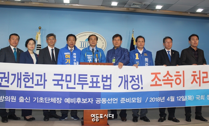 “6·13지방선거와 동시에 개헌 국민투표 이루어져야!" 기초자치단체장 예비 후보들이 지방분권 개헌을 촉구하고 나섰다.