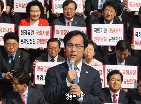 김영우 민주당원 댓글조작 진상조사단 단장(오른쪽 사진)은 “이번에 민주당원 댓글조작 사건은 여러분 드루킹을 비롯한 소수의 개인 일탈행위인가”라고 반문하고 “이것은 조직적이고 대규모적인 드루킹, 민주당원의 여론 조작 게이트다”고 주장했다.