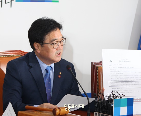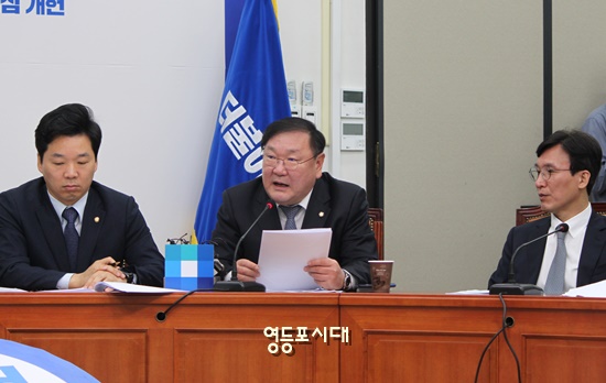 민주당은 18일 오전 국회에서 최고위원회의를 열고 “국민투표법은 20일 국회 본회의를 통과해야 한다”고 강조하고 야당의 적극적인 협조를 촉구하는 한편 김기식 전 금융감독위원장의 외유에 따른 선거법 위반에 관한 중앙선거관리위원회의 유권해석에 대해 강하게 비판했다. 우원식 원내대표(오른쪽 사진)는 자유한국당 김성태 원내대표가 자신의 페이스북에 올린 “오늘부터 4월 임시국회가 시작된다”며 “오직 민생을 위해 누구보다 먼저 몸부림치고 움직이겠다”고 올린 글을 인용 “4월 임시국회 회기가 3분의 2를 지났는데 민생은 안중에 없고 정쟁에만 몸부림치고 있다”고 날을 세우고 “일 좀 하자고”며 자유한국당의 국회일정에 대한 협조를 거듭 촉구했다. 우 원내대표는 오늘로 국회 파행이 벌써 18일째 이어지고 있는 점을 지적하고 “9천 건이 넘는 법안들은 물론, 시간이 생명인 추경도 국회 문턱을 넘지 못하고 있다”며 거듭 자유한국당의 국회일정에 대한 협조를 당부했다. 윤관석 최고위원은 “한국 GM이 군산공장 폐쇄를 발표한 이후 노측과 사측, 정부와 정치권이 나서 해결을 위해 다양한 소통채널을 가동하며 정상화를 위해 노력하고 있지만, 여전히 해결의 실마리가 보이지 않아 걱정스럽고 안타깝다”고 밝히고 “앞으로도 한국 자동차 산업의 명운이 걸렸다는 자세로 한국GM 사태 해결에 최선을 다하겠다”고 약속했다.