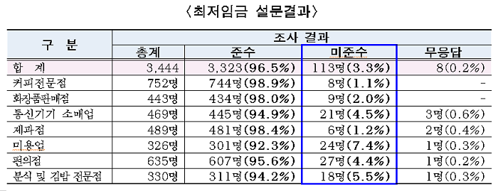 <②최저임금 준수여부>와 관련해서는 조사대상 3,444명 가운데 대부분인 3,323명(96.5%)이 최저임금 이상(시급 6,470원/2017년 기준)을 받고 있다고 답했다. 최저임금 이하를 받는다는 답변을 113명으로 3.3%에 그쳤다. 업종별로 살펴보면 ▴미용업(7.4%) ▴분식 및 김밥전문점(5.5%)에서 최저임금을 받지 못하고 있다는 답변이 다른 업종에 비해 상대적으로 많아 열악한 상황인 것으로 나타났다.