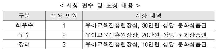 유아교육진흥원을 체험한 누구나 온라인으로 참여 가능 유아교육진흥원의 성과와 우수 사례를 발굴하여 일반 국민의 유아교육진흥원에 대한 관심을 높이고 이용자의 다양한 활용법을 공유하여 이를 확산하기 위한 공모전이 5월 4일(금)부터 5월 18일(금)까지 15일 동안 열린다.