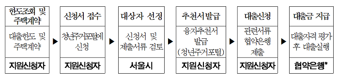 서울시가 전국 지자체 최초의 ‘신혼부부 임차보증금’ 지원을 15일부터 접수 시작한다. 융자 지원을 희망하는 (예비)신혼부부는 국민은행 지점을 방문해 대출한도에 대한 사전상담 후 임차보증금 5억 원 이하의 주택을 임대차계약을 체결하고, 관련 서류를 준비해 서울시 청년주거포털(http://housing.seoul.kr)에 신청하면 된다. 이후 신청자에 대한 조건검토 후 추천서가 발급되며, 이 추천서와 추가서류를 지참해 국민은행에 대출신청을 하면 입주일에 맞춰 대출금이 임대인의 계좌로 지급된다.