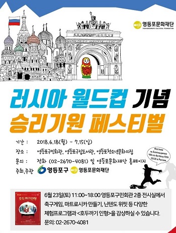 23일 오전 11시부터 오후 6시까지 영등포아트홀 2층 전시실에서 월드컵 개최국인 러시아의 문화와 월드컵에 관련된 전시 및 체험프로그램을 한 자리에서 만날 수 있다. 이날 진행되는 행사는 ▲러시아의 마스코트 마트료시카 만들기 ▲고로드키 등 러시아 전통민속놀이 체험 ▲러시아인과 함께하는 다문화 프로그램 ▲나만의 클레이 캔들 만들기 ▲러시아 전통 의상 체험, ▲닌텐도 위핏을 이용한 축구공 헤딩경기 ▲테이블 축구 ▲영등포문화재단 마스코트 ‘씽이’ 캐릭터와 함께하는 승부차기 게임 등 다양한 축구게임과 포토존을 마련해 어린아이부터 부모님까지 전 세대가 월드컵에 관심을 갖고 함께 참여 할 수 있다. 뿐만 아니라 예술의 전당 ‘SAC on SCREEN(예술의 전당 우수 예술 콘텐츠를 대형 스크린을 통해 함께 보고 즐기는 프로젝트)’ 중 러시아를 대표하는 작품인 국립발레단의 ‘호두까기 인형’과 축구공으로 각종 묘기를 선보이는 ‘프리스타일 축구 공연’을 함께 관람할 수 있다. 이 외에도 페스티벌 기간 동안 영등포구립도서관, 영등포아트홀, 영등포청소년문화의집 곳곳에서 다양한 전시 및 체험프로그램을 진행한다. 각각의 일정은 영등포문화재단 홈페이지를 통해 확인하거나 전화(2670- 4081)로 문의하면 된다. 구 관계자는 “러시아 월드컵을 기념해 시민들과 함께 즐길 수 있는 다양한 프로그램을 마련했다.”며 “페스티벌에 참여해 대한민국의 선전을 기원하며 특별한 추억도 쌓으시기를 바란다.”고 전했다.