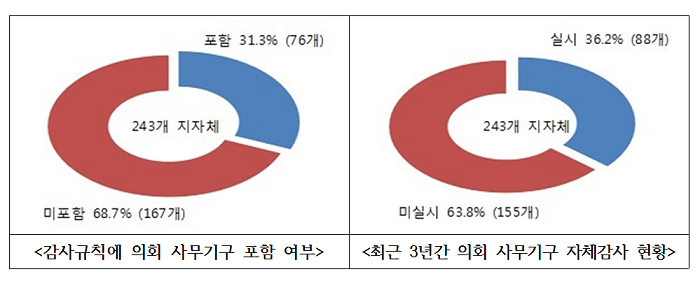 “*지방의회 자체감사를 받지 않는 것은 잘못된 관행” *관광성 해외연수, 주점·공휴일 업무추진비 사용 지방자치단체 자체감사운영에 필요한 사항을 규정한 ‘감사규칙’의 감사 대상 기관으로 지방의회 사무기구를 포함하지 않은 지자체가 167개인 것으로 나타났다. 또 최근 2015년부터 2017년까지 3년간 자체감사를 받지 않은 지방의회 사무기구는 155개 기관으로 지방의회의 예산사용에 대한 감사가 매우 미흡한 실정이다. 이에 따라 국민권익위는 ‘지방의회 예산집행의 사후관리 강화방안’을 마련하여 지방자치단체 ‘감사규칙’의 감사 범위에 의회 사무기구가 포함되도록 하고 지방자치단체는 감사기구를 통해 의회 사무기구에 대한 재무감사 등을 주기적으로 실시하도록 지방자치단체에 권고했다. 그동안 감사의 사각지대에 있던 지방의회 예산집행이 앞으로는 더 투명해질 것으로 전망된다. 국민권익위원회(위원장 박은정, 이하 국민권익위)는 지방의회에 편성된 예산을 편법·부당하게 집행하는 사례가 빈발함에 따라 경기도 등 지방자치단체에 ‘지방의회 예산집행의 사후관리 강화 방안’을 마련하여 권고했다고 21일 밝혔다. 2018년 12월 기준으로 243개 지방의회 광역·기초의원은 3,702명이며, 지방의회 예산규모는 약 2,342억원으로 의회운영경비, 의정활동비, 업무추진비, 여비 등으로 편성·집행되고 있다. 지방의회를 포함한 지방자치단체는 ‘공공감사에 관한 법률’, ‘지방자치법’, ‘감사원법’ 등 관련 법령에 따라 자체감사를 시행하거나 외부감사를 받도록 정해져 있음에도 불구하고 많은 지방의회의 예산집행은 감사의 사각지대로 방치돼 왔다. 그동안 일부 지방의회는 지방자치단체의 예산 관련 규정, 지방의회의원 행동강령 제정·운영 등에도 불구하고 업무추진비 카드를 주점·공휴일·심야시간대에 사용하거나 동료의원 등의 선물, 격려금품 구매에 사용하였으며, 직무와 관련이 없는 관광 위주의 해외연수에 예산을 집행하기도 하였다. 2015년, 2017년 권익위 행동강령 점검결과 ○○도의회 상임위원장은 1년(2016년 7월부터 2017년 6월 사이에 업무추진비 집행이 제한된 공휴일, 심야시간대(23시 이후)에 정당한 사유 없이 17회에 걸쳐 265만원 사적으로 사용하고, ○○시의회 의장은 ‘2015년 3월 동료의원 명절선물 명목으로 9만9천원 상당의 세트 21개를 제공하기 위하여 업무추진비 카드로 208만원을 결제한 것으로 확인됐다. 또한 ○○시의회 부의장 등 11명은 ‘2016년 5월 6일간 유럽으로 국외연수를 실시하면서 연수 일정을 임의로 변경하여 주요관광지를 견학한 것으로 나타났는가 하면 의원별로 의정활동비가 지급됨에도 휴대전화비, 교통비 등의 지원 명목으로 예산을 집행하거나 법적 근거 없이 동호회 활동비를 부당하게 지원하기도 했다. 이밖에도 2017년 감사원 감사결과와 2017년 권익위 행동강령 점검결과 ○○시는 지방의원 1인당 조례에 따라 지급한 의정 활동비와 별도로 휴대전화·태블릿PC 사용요금, 교통비 등의 명목으로 연간 1인당 최대 459만원을 초과 지급하는 등 5년간 총 161,051만원을 부당하게 지급하였고, ○○도의회는 법적 근거 없이 의원들의 동호회(축구, 골프, 승마 등) 활동에 해외활동비, 회식비, 사적물품 구매 등으로 2년 동안 43회 7,299만원 부당 지원했다.
