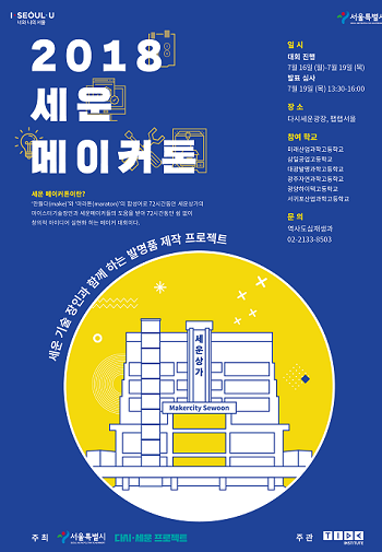 서울시가 전국 6개 발명특성화고등학교 12팀 학생들이 낸 아이디어를 세운상가의 마이스터 기술장인, 청년 메이커들이 멘토가 돼 실제 제품으로 만드는 ‘2018 세운 메이커톤’ 대회를 처음으로 16일(월)부터 19일(목)까지 3박4일 동안 세운상가 일대(세운홀/팹랩서울)에서 개최한다.
