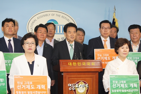 민주평화당 정동영 의원(사진 가운데)은 18일 국회 정론관에서 기자회견을 열고 “민주평화당에 ‘손에 잡히는 변화’를 만들겠다”며 당대표 후보자 공약을 발표했다.