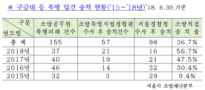 정문호 서울소방재난본부장은 “시민이 안심하고 생활하는 안전 특별시 구현을 위해 맡은바 묵묵히 임무를 수행하고 있는 119구급대원에 대한 폭행 등 소방활동 방해 행위는 용인할 수 없다”고 목소리를 높였다. 정 본부장은 이어 “전국 최초 119광역수사대 설치‧운영으로 수사의 전문성을 높여 시민의 권익을 보호하고, 제복공무원이 자부심을 가지고 근무할 수 있는 환경을 만들어가겠다”며 “시민의 적극적인 협조”를 당부했다.