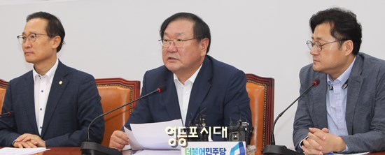 홍영표 원내대표(오른쪽 사진 가운데)는 24일 “북한이 미사일엔진시험장인 서해 위성발사장 해체에 착수한데 이어 어제 평양 인근의 ICBM 조립시설도 해체한 것으로 알려졌다”며 이같이 밝혔다. 홍 원내대표는 “비핵화를 위한 한미 동맹”을 강조하고 “지난 4.27 판문점선언에서 합의한 대로 정전협정 체결 65주년이 되는 올해 종전을 선언하겠다는 우리의 목표가 이뤄지기를 기대한다”고 밝혔다. 김선수 대법관 후보자에 대한 경과보고서 채택이 불발된 것과 관련 “김선수 후보자는 평생을 노동, 인권변호사로서 사회적 약자를 변론해왔으며, 대법관추천위가 3년 연속 후보자로 추천할 정도로 검증받은 분이다”고 강조하고 “그런데도 자유한국당은 김 후보자에게 이념편향성이란 낡은 잣대를 들이대면서 반대하고 있다”고 비판했다. 자유한국당은 김선수 후보자가 과거 청와대 비서관으로 재직한 경력을 문제 삼아 ‘3권 분립’의 정신에 위배된다며 경과보고서 채택에 반대하고 있다. 홍영표 원내대표는 이와 관련 “3권 분립의 정신을 무너뜨린 것은 지난 정권과 재판거래를 시도한 양승태 사법부이다”고 직격탄을 날리고 “김 후보자는 오히려 무너진 3권 분립의 정신을 바로잡을 수 있는 적임자이다”고 강조하고 자유한국당의 적극적인 호응”을 부탁했다. 홍영표 원내대표는 기무사 관계자들이 사후 보고 경위를 둘러싸고 진실공방을 벌이는 것과 관련 “계엄문건 작성과 기무사 개혁에 반대하는 조직적 저항이 아닌가 하는 의구심이 강하게 든다”며 “이번 사건의 본질은 기무사의 국헌문란, 내란음모 행위에 대한 철저한 진상 조사를 하는 것이다”고 강조했다. 홍 원내대표는 “계엄문건 작성자들은 책임을 회피하려는 말을 앞세우기보다, 진중한 자세로 수사에 먼저 임해야 한다”며 “국방부 특수단과 검, 군 합수단의 철저한 수사가 중요하다. 신속하고 철저한 수사로, 기무사 계엄문건 사건의 본질을 흐리려는 물타기 시도를 차단해야 한다”고 강조했다.