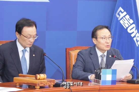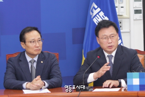 박광온 최고위원(오른쪽 사진 오른쪽)은 자유한국당이 김경수 경남지사를 국정감사 증인으로 신청한 것과 관련 “특검 조사를 통해 김경수 지사의 혐의를 사실상 특정하기 어렵다 하는 것이 드러났다”고 주장하고 “그래서 특검조차 참으로 모호한 상황에서 특검을 사실상 마무리 짓고 기한연장신청까지 하지 않았다”고 강조했다.