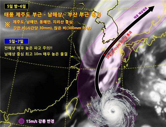 태풍 ‘콩레이’는 북태평양고기압 가장자리를 따라 계속 북서진한 뒤 5일(금) 오전에 점차 북동쪽으로 진행 방향을 바꾸어(전향) 6일(토)에는 제주도 부근과 남해상, 부산 부근을 지나 제주도와 남부지방을 중심으로 전국 대부분 지역에 영향을 미칠 것으로 예상된다. 기상청은 “태풍의 진행 속도가 다소 빨라지면서 남해안에 상륙할 가능성도 있으니, 최신의 태풍정보를 참고하기 바란다”고 당부했다. 5일(금)부터는 태풍이 26도 이하의 상대적으로 낮은 해수면온도 구역으로 진입하면서 태풍의 강도는 점차 약화되겠으나, 우리나라 서쪽에서 접근하는 찬 공기를 동반한 기압골과 충돌하면서 매우 강한 바람과 함께 많은 비를 동반할 것으로 예상된다. 기상청은 “이에 따라 5일(금)에는 제주도해상, 남해상, 서해남부에 태풍특보가 발표되겠고, 6일(토)에는 내륙에도 태풍특보가 확대 발표될 것이다”고 밝히고 “특히 6일(토) 새벽~낮에는 태풍이 우리나라에 가장 가깝게 접근하면서 비와 바람의 강도가 가장 최고조에 이를 것으로 예상했다. 기상청은 태풍이 북상하면서 전면에서 발생한 비구름대의 영향으로 4일(목) 밤에 제주도에 비가 시작되어 5일(금)은 전국에 비가 내리겠고, 6일(토)에는 태풍에 동반된 비구름대의 영향으로 전국 대부분 지역에 비가 내릴 것으로 예상했다. 특히, 5일(금)~7일(일)에는 태풍의 예상 이동경로에 가장 가까운 제주도와 남해안, 동해안, 지리산 부근을 중심으로 강풍과 천둥번개를 동반한 시간당 30mm 이상의 강한 비가 내리겠고, 300mm 이상의 매우 많은 비가 내리겠다고 예보하고 그 밖의 전국에서도 100mm 이상의 많은 비가 오는 곳이 있겠으니, 비 피해로 인한 안전사고에 각별히 유의해 줄 것을 당부했다. 태풍이 남해상을 통과하는 5일(금) 오후~6일(토)에는 남해안과 제주도를 중심으로 최대순간풍속 초속 35~40m(시속 126~144km) 이상의 강한 바람이 불겠으니, 시설물 관리에 각별히 유의하기 바라다고 거듭 당부했다. 또한, 4일(목)~5일(금) 경, 제주도해상과 남해 먼 바다에 바람이 점차 강해지고 물결도 최고 7m 내외까지 매우 높게 일겠고, 6일(토)~7일(일)에는 제주도해상에 최고 10m 등, 대부분 해상에서도 강한 바람과 함께 물결이 매우 높게 일것으로 내다봤다. 특히 제주도해안과 남해안, 동해안을 중심으로 너울에 의해 높은 물결이 해안도로 또는 방파제를 넘을 가능성이 있으니 해상선박 관리 및 해상 안전사고에 각별히 유의해 줄 것을 당부했다.