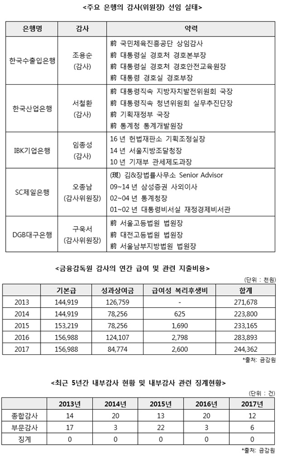 정부의 관료 출신으로 근무 중인 곳은 산업은행의 서철환 전 대통령 직속 지방자치 발전위원회 국장, 수출입은행의 조용순 대통령실 경호처 경호본부장, IBK기업은행의 임종성 전 헌법재판소 기획조정실장, SC제일은행의 감사위원장은 오종남 전 통계청장, 대구은행의 감사위원장은 구욱서 전 서울고법원장으로 대부분이 박근혜 정부 당시 임명된 비전문, 정치적 판단의 전형적인 낙하산 인사라고 볼 수 있다. 금소원 “무엇보다 문제는 금감원이다”고 주장하고 “금감원은 은행권의 감사를 총괄하는 기관인데 이번 정부 들어서도 낙하산 인사의 전형을 유감없이 보여주었다”고 날을 세웠다. 이번 정부 들어 임명된 금융감독원 김우찬 감사는 경희대 출신이며 경희 법조인 회장을 역임한 판사 출신이다. 2017년 금감원이 김 감사에게 지급한 급여는 2억5000만원 정도였다. 금융에 대한 비전문가이고, 선거 공신 인사를 보상 차원 낙하산 인사로 금융총괄 감독기관의 감사를 맡는 것 자체가 이해할 수 없는 개탄스러운 인사라 할 수 있을 것이다. 촛불 정부를 주장하는 이번 정부가 적폐청산을 외치며 이런 행태의 인사를 태연히 자행하고 있는 것은 금융에 대한 무지함을 보여주고 있다는 비판을 면하기 어려울 것이다. 최근 5년간 금감원의 감사가 내부감사한 건수는 연평균 26건에 이른다. 그러나 작년의 경우 18건으로 이번 정부 들어 내부감사도 현격히 줄었다. 금소원은 “개혁을 해도 모자랄 판에 내부감사를 더 소홀히 한 것으로 볼 수밖에 없다”고 주장하고 “금감원이 제대로 내부개혁, 내부감사는 하지 않고 있음을 그대로 보여주고 있다”고 비판했다. 금소원은 또 “금감원 감사를 주로 한 최근 5년간의 내부감사에서 징계 건수가 하나도 없다는 것은 감사의 역할이 과연 있는지를 의심받게 한다”며 “이런 감사와 내부통제시스템을 갖추고도 금감원은 허구한 날 금융사 감사를 하겠다고 발표만 하고 있다. 어이가 없다”고 실소를 보냈다. 금소원은 “은행권의 감사 자리가 놀고먹는 자리로 인식, 운영되고 급여는 3~4억원을 받으며 정치권의 전리품 자리로 전락한 이런 개탄스러운 상황이 지금도 아무런 변화나 조짐이 없다”고 주장했다. 금소원은 이어 “‘이게 금융이냐?’라는 것을 말해주고 있다”며 “청와대는 당장 금감원 감사와 산업은행, 수출입은행 등의 감사들부터 인사개혁 차원에서 즉각 면직 처리하고 감사역할을 제대로 수행할 수 있는 인사 임명과 혁신적 감사시스템이 정착될 수 있는 대책을 제시하라”고 촉구했다. 금소원은 “대책 제시를 시작으로 한국거래소 이사장 등을 비롯한 금융권 전반의 적폐 인사, 무능 인사, 정실인사 등 실패인사들을 정리해야 할 때이다”라고 덧붙였다.