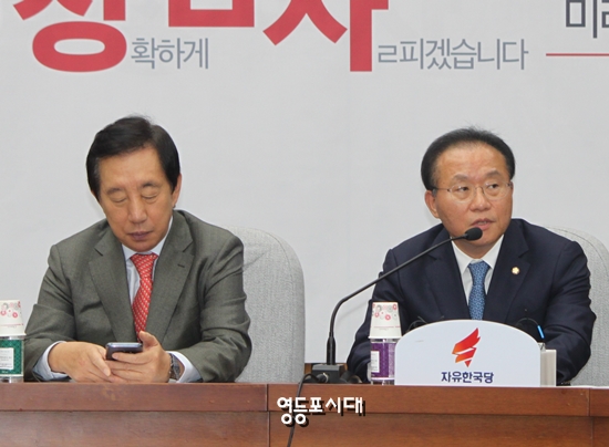 김성태 원내대표(사진 오른쪽)는 “허수아비 장관들을 내세워 국민들에 대한 책임과 도리를 회피하려는 문재인 정권에 다시 한번 깊은 유감을 표하지 않을 수 없다”며 이같이 비판했다. 김 원내대표는 유은혜 장관과 국방부, 산업통상자원부, 고용노동부, 여성가족부 등 신출내기 장관들을 내세워 국민 앞에 어떤 책임 있는 답변을 하겠다는 것이냐“뭐 ”야당은 반드시 문재인 실정과 정책실패의 책임을 분명하게 물어갈 것이다”고 밝혔다. 평양 방문 당시 “국가보안법을 재검토 하겠다”고 밝힌 이해찬 민주당 대표의 발언에 대해서도 서울에 와서 한 발짝 슬쩍 뒤로 물러나는 모습을 보였다“고 비판하고 ”그렇다면 도대체 뭘 어떻게 하겠다는 것인지 분명히 말씀해 주기 바란다”며 이해찬 대표의 입장 표명을 촉구했다. 문재인 대통령이 이번 주말부터 7박 9일간 유럽순방에 나서는 것에 대해서도 비판의 날을 세웠다. 김성태 원내대표는 “대정부질문 기간에는 장관들 대동하고 평양에 가 계시더니 국정감사 기간에는 유럽에 가 계시겠다고 한다”면서 “가실 때 가시더라도 국정감사 받아야 할 장관들은 반드시 남겨 두고 다녀오시기 바란다”며 에둘러 비판했다.