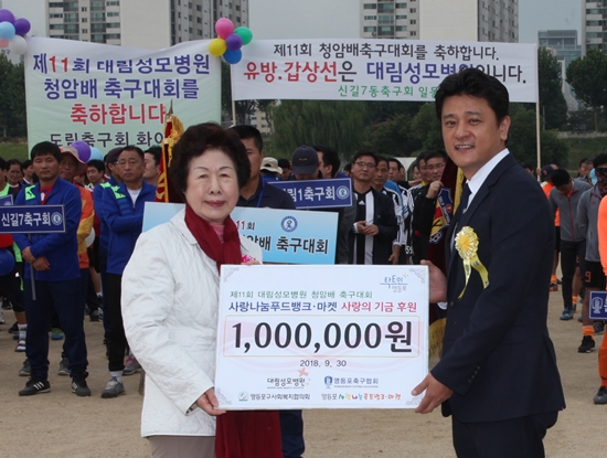 영등포구축구협회는 매년 자선행사로 사랑의 기금 전달식을 이어오고 있다. 이날 영등포구축구협회가 영등포사랑나눔푸드뱅크·마켓에 전달한 사랑의 기금은 제11회 대림성모병원 청암배 축구대회를 기념하여 회원들이 모은 것으로 알려졌다. 영등포사랑나눔푸드뱅크·마켓 관계자는 “이번에 기부받은 후원금은 이용대상자들이 선호하는 물품을 구매하여 1.2.3호점 매장에 비치해 이용자들의 선택 폭을 넓히는 한편 이용자들의 만족도 향상을 위해 더욱더 노력하겠다”고 전했다. 이날 열린 제11회 대림성모병원 청암배 축구대회에는 16개의 지역생활축구팀이 참가하여 열띤 경쟁을 펼쳤으며 도림 B팀이 우승했다.
