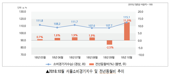 서울연구원(원장 서왕진)은 ‘2018년 10월 카드매출 빅데이터를 통해 본 서울소비경기지수’를 발표했다.