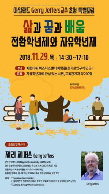 11월 29일(목) 오후 3시부터 을지로 인근 페럼타워 페럼홀에서 열리는 이번 제리 제퍼스 교수 초청 특별 포럼’ 아일랜드 전환학년제(Transit Year)의 전문가인 제리 제퍼스(Gerry Jeffers), 전 아일랜드 국립 메이누스(Maynooth)대 교수를 초청하여 전환학년제와 자유학년제의 관계를 알아보고 공교육의 다양성을 모색하기 위해 진행한다. 제리 제퍼스 교수는 2013년도에도 한국직업능력개발원의 초청으로 내한한 바 있으며, 전환학년제의 권위자일 뿐만 아니라 우리나라의 자유학년제에 대해서도 관심과 이해를 가진 학자이다. 이번 포럼은 ‘삶과 꿈과 배움 – 전환학년제와 자유학년제’라는 주제로 아일랜드의 전환학년제를 알아보고, 우리나라의 자유학년제와 관련지어 학생들의 배움이 삶, 꿈과 일치하는 교육의 가능성을 살펴볼 예정이다. 서울시교육청교육연구정보원은 ‘전환학년제를 통하여 자유학년제의 방향성을 탐색하고 가능성을 공유하는 계기가 될 것’이라고 밝혔다.