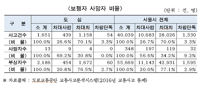한국교통안전공단에 따르면 차량 주행속도가 시속 60km인 경우 보행자의 중상가능성이 92.6%에 달하지만 주행속도가 시속 50km일 때는 72.7%, 시속 30km일 때는 15.4%로 낮아진다. 지난 11월 29일 개최된 서울지방경찰청 교통안전시설 심의위원회에서 사대문안 지역과 청계천로 전체구간에 대한 서울시의 제한속도 하향 계획이 가결됨에 따라, 서울시는 12월부터 교통안전시설 개선공사를 시행한다. 대도시 도심지역 대상으로 최초로 시행되는 안전속도5030 사업인 만큼 시는 운전자 시인성 향상, 사대문안 안전속도5030사업 홍보를 위한 발광형LED표지 등 교통안전시설물을 집중적으로 설치할 계획이다. 나아가 시는 자동차전용도로를 제외한 서울시내 전역의 도로에 원칙적으로 안전속도 5030을 적용해 나간다는 방침이다. 보행자 안전을 강화하고 제한속도의 일관성을 높여 운전자 혼란을 예방하기 위함이다. 최근 5년간 서울시내 교통사고사망자수가 감소추세에 있음에도 보행자 사고인 ‘차 대 사람’ 사고의 사망자 비율은 50% 중반으로 높은 실정이다. 시는 안전속도 5030 확대와 더불어 무단횡단금지시설 확충 등 시설측면에서도 다각도의 안전장치를 취한다는 계획이다. 고홍석 서울시 도시교통본부장은 “매년 서울시에서 보행 중 교통사고로 인해 약 200명의 시민의 희생되고 있어 보행자 교통안전대책이 절실하다.”며 “금번 사대문안 도심 제한속도 하향사업을 통해 서울시 도심지역이 보행자와 교통약자의 교통안전이 더욱 강화되고 걷는 도시, 서울이 정착되는 계기가 될 것으로 기대한다.”라고 밝혔다.
