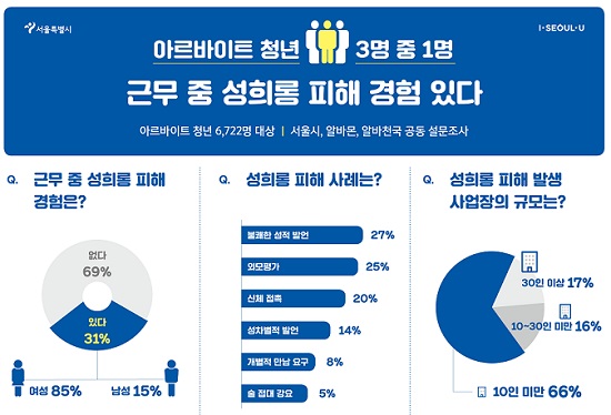 서울시와 알바몬, 알바천국이 전국 아르바이트 청년 6,722명을 대상으로 11월 11일부터 21일까지 10일 간 공동 조사한 결과 31%, 3명 중 1명꼴로 근무 중 성희롱 피해를 경험한 것으로 나타났다.