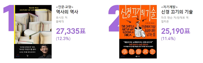 서점 예스24(대표 김석환)가 한 달간 진행한 2018년 독자들에게 가장 많은 사랑을 받은 ‘올해의 책’과 ‘올해의 커버’를 뽑는 온라인 투표에서 올해의 책 1위에 <역사의 역사>가, 올해의 커버 1위에는 <하마터면 열심히 살 뻔했다>가 선정됐다고 7일 밝혔다. 이번 투표 이벤트에는 총 22만1538명의 독자가 참여했다.