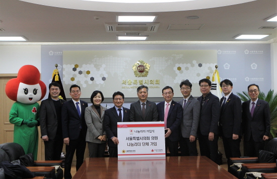 11월 27일, ‘서울나눔명사 열매달기’를 진행하며 이웃 사랑 성금을 전했었던 서울시의회는 서울시의 시민의 대표, 나눔의 대표가 되어 행복을 나누고 나눔문화 확산에 기여하고자 서울시의원들의 뜻을 모아 나눔리더 단체가입을 진행했다. 신원철 시의장은 “지역사회 문제 해결과 이웃사랑을 실천하며 성숙한 기부문화를 이끌어주신 동료 시의원들게 감사드린다. 우리가 가진 1%의 나눔으로 99%의 행복을 채울 수 있어서 행복하다.” 며 “배려와 공감으로 함께 사는 포용서울을 위해 항상 시민의 곁을 지키는 의회가 되도록 노력하겠다.”고 전했다. 황후영 서울 사랑의열매 사무처장은 “서울시의회와 서울 사랑의열매가 함께 서울시민행복을 위해 노력하고 있다.” 며 “서울 사랑의열매는 서울시의원님들의 나눔리더 가입으로 나눔문화확산에 큰 힘을 얻어 지역사회와의 유기적인 협력과 연대로 지역복지 발전복지 사각지대 해소에 최선을 다하겠다.”고 말했다. 이날 진행한 나눔리더 단체가입식에는 나눔리더로 가입한 신원철 시의장, 김생환 부의장, 박기열 부의장, 김용석 대표의원, 이광성 부위원장, 이병도 부위원장, 강동길 위원, 김용연 위원, 송아량 위원, 이은주 위원, 이승미 위원, 정진철 위원과 이를 축하하기 위해 황후영 서울 사랑의열매 사무처장과 직원들이 함께하였다.