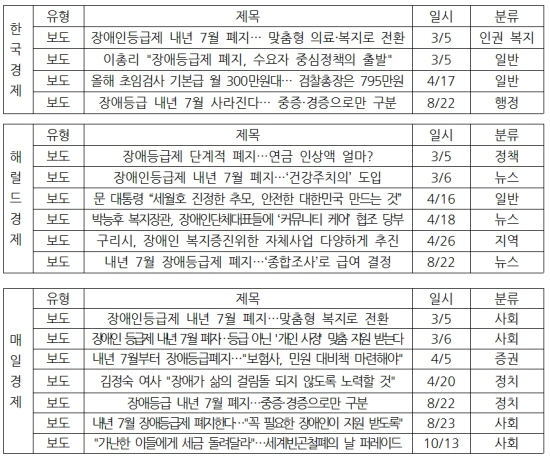 ‘장애등급제’를 모니터한 ‘언론에 나타난 ‘장애등급제’’는 김태현 정책실장(한국뇌병변장애인인권협회)에게 의뢰하여 1월부터 11월까지 ‘네이버’와 ‘다음’에 ‘장애등급제’ 관련 보도를 2013년 보도기사와 비교하여 분석하였고 ‘영상 속 장애인’은 김헌식 대중문화평론가에게 의뢰하여 영화와 드라마에 출연한 장애인을 분석하였다. ‘장애등급제’ 모니터 결과 기사의 수나, 내용 면에서 보았을 때 과거에 비해 언론에서 ‘장애등급제’를 많이 다루고 있다. 기사 유형을 살펴보면 기획 5건, 보도 51건, 인터뷰 2건, 사설·칼럼·기고 6건으로 총 64건이 보도되어 2013년도 총 24건이 보도되었던 것에 비해 많이 기사화되었다. 시기별로는 2013년도에는 4월 20일 장애인의 날을 전후로 ‘장애등급제’를 언급하거나 기획기사로 심도 있게 다루는 양상을 띠었다면 올해는 정부의 정책 또는 제도 개편 발표가 있거나 장애인 당사자의 투쟁이 이슈화되었을 때 기사화되었다. 그 중 눈여겨봐야 할 기사로 헤럴드경제의 ‘구리시, 장애인 복지증진위한 자체사업 다양하게 추진’이라는 기사는 장애등급제 개편에 따른 지자체의 대응에 관한 내용을 심도 있게 다루고 있고 제도가 바뀜으로 정부나 지자체가 그것에 어떻게 준비하고 대처해야 하는지를 독자에게 잘 알려주었다. 모니터를 진행한 김태현 정책실장은 “기사의 수나 내용면에서 ‘장애등급제’를 많이 다루고 있지만 기사 내용들이 여전히 정부의 보도 자료에 의지하고 있으므로 앞으로는 언론에서 좀 더 객관적인 내용으로 기사를 실어야 한다”고 밝혔다. ‘영상 속 장애인’에 대한 모니터 결과 영화와 드라마에서 단순 엑스트라로 등장하던 수준이 아닌 올해에는 장애인이 처음부터 끝까지 주요 인물로 등장한 영상이 많았다. 그간 각계각층의 노력으로 장애인이 영화와 드라마에 과거보다 더 많이 등장하고 있으며 장애인과 비장애인이 다를 바 없이 자신의 일을 갖고 능동적이고 성취 지향적이면서 사회 정의를 위해 분투하는 핵심적인 인물로 등장하는 등 예전에 비해 질적 성장을 했다. 그 예로 드라마 ‘라이프’에서 ‘예선우(이규형)’는 정형외과 전문의로 등장하며 교통사고를 통해 중도 장애를 갖게 된 캐릭터로 누구라도 장애인이 될 수 있고 전도유망한 직종의 종사자가 될 수 있음을 잘 보여준다. 또한 쉽고 편리하게 접을 수 있는 전동휠체어가 등장하고 집안에 있는 핸드레일, 장애인 택시 이동장면, 장보기 등을 자세하게 보여주어 휠체어 이용자의 현실을 잘 묘사했다. 드라마에서는 발달장애인이 천재로 나오는 등 매우 드문 경우가 마치 일반적인 것처럼 오해를 주는 캐릭터 설정이 있었다. 또한 장애유형은 아니지만 ‘안면실인증’이 많이 등장했는데 이에 대한 실체적인 관심보다는 오로지 로맨스에 도움이 될 만한 부문만 편취하기도 했다. 모니터를 진행한 김헌식 대중문화평론가는 “올해는 장애에 관련한 드라마가 많이 제작되었고, 기존의 드라마와는 다른 차별화된 작품도 나와 호평이 이어지기도 했다”며 “그간 많은 장애인과 장애인 단체들의 미디어 모니터 운동의 산물”이라고 말했다. 장애인먼저실천운동본부는 매년 장애 관련 이슈를 기획 모니터하여 발표하고 있으며 이번 기획 모니터의 원문 자료는 장애인먼저실천운동본부 홈페이지에서 확인할 수 있다. 장애인먼저실천운동본부 개요 장애인먼저실천운동은 장애인을 배려하고 함께 살아가는 국민운동으로, 장애인의 사회통합 촉진을 위한 전국 초·중·고등학생 백일장, 대한민국 1교시, 뽀꼬 아 뽀꼬 캠프 및 음악회, 비바챔버앙상블 운영, 모니터 사업, 장애인식개선 드라마 제작 등 다양한 인식개선사업을 전개하고 있다.
