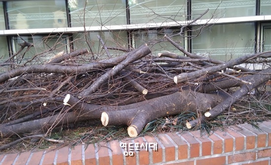2018년 12월 30일(일) 오전 본 기자 목격한 영등포노인케어센터 건물 뒤쪽 문래동성당 정문 앞에는 앙상하게 뼈대만 남은 소나무와 느티나무 밑동, 그리고 잘려나간 나뭇가지들이 방치되어 있었다.