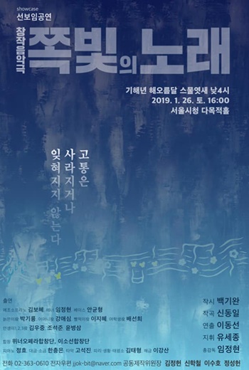 1980년 12월, 심한 고문을 받고 후유증에 시달리던 백기완은 젊은 남녘의 춤꾼에게 띄우는 장시 “묏비나리”를 썼다. 그 피를 토하는 절규는 2년 뒤 “임을 위한 행진곡”이라는 노래가 되었다. ‘사랑도 명예도 이름도 남김없이 앞서서 나가니 산자여 따르라’는 곡은 수백만 촛불의 노래가 되었다. 2014년 4월, 304명의 목숨을 집어삼켰던 검은 바다를 바라보던 백기완은 1980년 겨울의 목소리로 다시 문장을 꿰어 맞췄다. 잊지 않기 위한 울음으로 장시 “갯비나리”는 그렇게 완성되었다. 2017년 여름, 6월 민주항쟁 30주년 기념공연을 제작하고 연출했던 임정현과 이동선, 작곡가 신동일, 전태일재단 이사장 이수호, 전 민예총 이사장 신학철 등은 백기완의 “갯비나리”를 음악극으로 만들기로 했다. 2017년 겨울에는 “쪽빛의 노래-백기완의 갯비나리” 대본 초안이 완성되었다. “쪽빛의 노래”의 총기획자인 서우영은 ‘세월호를 기억하는 것은 그 죽음을 모독했던 비뚤어진 사회를 기억하는 것이며, 타락한 정치와 사회가 만들어 낸 수많은 죽음의 고통을 끌어안는 것이다’라며, ‘우리는 고통을 되새기며 승화시켜야 한다. 그래서 고통을 노래하려 한다’고 말했다. 백기완 소장은 ‘세월호 어린 생명들을 기리는 장편 비나리(서사詩)를 써달라고 해서 적어주었더니 여러 예술가가 모여 ‘쪽빛의 노래’라는 노래극으로 만들었다’며 본공연(올 5월 예정)에 앞서 여는 시연회에 함께해 주기를 당부했다. 시연회는 1월 26일 오후 4시 서울시청 다목적홀에서 선보인다. 자세한 내용은 제작위원회(02-363-0610)에 문의하면 된다.