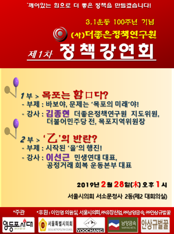 (사)더좋은정책연구원 주최, 영등포시대 주관으로 특별한 강연회가 열린다. 바로 목포시 도시재생사업의 실체와 진실, ‘을’들의 반란, ‘을’들의 행진을 주목할 수 있는 강연회가 바로 그것이다. 더좋은정책연구원(이사장 김범태, 연구원장 김을규)은 2월 28일 오후 4시 서울시의회 서소문청사 2동, 제2 회의실에서 3•1운동 100주년을 기념해 강연회를 개최한다. 주간 영등포시대•인터넷신문 영등포시대 주관으로 개최되는 이번 강연회는 1부(김종현 전 민주당 목포시 지역위원장) “목포는 함口다”(부제 : 바보야 문제는 목포의 미래야!)와 2부(이선근 민생연대 대표) ‘을’의 반란(부제 : 시작된 ‘을’의 행진)을 주제로 진행될 예정이다. 1부 강사로 나서는 김종현 전 민주당 목포시 지역위원장은 지난 대선 당시 문재인 후보의 ‘목포! 미래에 대한 마스터풀랜’을 설계하고 예산확보에도 남다른 노력을 기울여 왔다. 김 전 위원장은 이날 ‘목포의 눈물’과 ‘회한’을 통해 목포 갈등과 친일문화 잔재, 그리고 도시재생사업의 허와 실에 대한 진실을 명쾌한 해설과 함께 풀어나갈 예정이다. 목포의 도시재생사업을 두고 무소속 손혜원 의원과 민평당 박지원 의원 간의 ‘투자냐’, ‘투기냐’의 설전이 이어지고 있는 가운데 목포시 도시재생사업의 밑그림을 그리고 예산을 확보하는 데 노력을 기울여온 김종현 전 목포시 지역위원장이 진실을 어디까지 쏟아낼지 귀추가 주목된다. 2부 강사로 나서는 이선근 민생연대 대표는 1980년대 대표적 공안 사건인 학림사건으로 인권을 유린당한 사회운동과 민생분야 전문가로 ’700만 소상공인‘의 반란 예방과 인권증진을 위한 대안을 제시하며 ‘을’의 눈물과 분노를 거침없이 풀어놓을 것으로 예상한다. 더좋은정책연구원 김을규 원장은 “이날 강연회를 시작으로 4월 1일 지방분권과 관련한 세미나를 준비 중이다”고 밝히고 “더좋은정책연구원의 더 좋은 정책연구와 사회현안에 대한 접근 방식을 눈여겨 봐줄 것”을 당부했다. 김 원장은 이어 “목포시 도시재생사업에 관한 궁금증과 ‘을’의 현실을 체감할 수 있을 것으로 기대한다”라며 “강연회에 많은 관심과 성원”을 부탁했다. 3•1운동 100주년을 기념해 개최되는 이번 강연회는 할 말은 많은데 말할 곳은 없고, 도시는 피폐해져 가는데 특별한 대안을 찾지 못하는 목포시와 ‘갑’의 횡포로 인하여 사업장을 문 닫고 피폐해져 가는 가정을 지키기 위해 몸부림치는 ‘을’의 이야기가 2월 28일 서울시의회 서소문 청사 2동, 제2 회의실에서 펼쳐질 것으로 보인다.