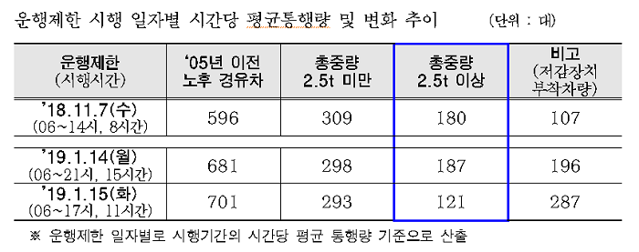 그러나 이는 저감장치 부착 등 효과이며, 노후 경유차 운행 시민들의 불편을 최소화했고, 운행제한 대상인 총중량 2.5t 이상의 통행량은 지난 11월 대비 비슷하거나 상당히 줄어든 것으로 나타났다. 이는 미세먼지 비상저감조치시 운행제한 및 단속에 대한 적극적인 홍보 성과와 시민들도 미세먼지 문제에 관심을 두고 적극적으로 참여한 결과로 보인다. 서울시는 1월 13(일)부터 1월 15(화), 사흘간 고농도의 초미세먼지 발생으로 발령기준이 충족되어, ‘비상저감조치’를 발령하였다. 이에 따라 ‘2005년 12월 31일 이전 수도권 등록 총중량 2.5t 이상 경유차에 대하여 1월 14(월), 1월 15(화) 운행제한을 시행했다.
