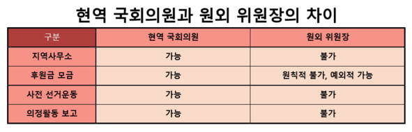 현행법에 따르면 국회의원 지역구 및 자치구·시·군, 읍·면·동별로 당원협의회를 둘 수 있다. 그러나 사무실과 유급사원을 둘 수 있는 현역의원과 달리 원외 위원장은 사무실을 둘 수 없다. 만약 사무실을 두면 유사기관으로 선거법 위반이다. 그뿐만 아니라 현역의원은 정해진 한도 내에서 자유롭게 후원금을 받을 수 있는데 반해 원외 지역위원장은 원칙적으로 후원금을 모금할 수 없다. 다만 예비후보로 등록한 이후에만 예외적으로 받을 수 있다.