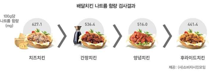 105건 조사결과, 치킨 가식부 100g의 나트륨 함량은 치즈치킨(627.1mg)이 가장 높고, 간장치킨(536.4mg) > 양념치킨(516.0mg) > 프라이드치킨(441.4mg) 순으로 프라이드치킨보다 간장치킨이 1.2배, 치즈치킨이 1.4배 나트륨 함량이 높게 나타났다.