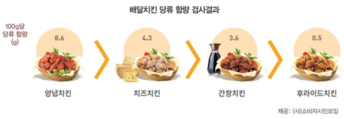 양념치킨 반 마리(가식부 300g 기준)를 먹을 경우 섭취하는 당류 함량은 최대 25.8g으로 하루 당류 기준치(100g)의 약 1/4에 해당하는 25.8%를 섭취하는 것으로 나타났다. 특히, 치킨은 콜라나 사이다 등 탄산음료와 함께 섭취하는 경우가 많아 당류 섭취량은 더 늘어날 것으로 추정된다.
