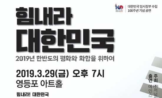 “한반도의 평화와 화합 그리고 대한민국 국민을 응원합니다!”를 부제로 열리는 “힘내라 대한민국” 뮤직콘서트‘가 바로 그것이다. ‘저널인미디어’는 3월 29일(금) 오후 7시 영등포아트홀에서 ‘대한민국 임시정부 100주년 기념’, ‘힘내라 대한민국’ 뮤직콘서트를 개최한다고 20일 오후 밝혔다. 한반도의 평화와 화합을 기원하고 대한민국 국민을 응원하기 위해 기획된 “힘내라 대한민국!”뮤직 콘서트는 ‘저널인미디어’ 주최 뉴스프리존·사회적 공론화 미디어 협력으로 개최되며 1부, 2부로 나눠 진행된다. 먼저 1부에서는 설호종 씨의 대북 퍼포먼스, 독립투사 영상 소개에 이어 국악밴드 예인스토리의 ‘새야 새야’ ‘독립군가’ ‘오빠 생각’ 등이 대금과 아쟁의 연주로 이어진다. 1부 마지막 순서는 소프라노 임청화 교수와 환경운동가 이기영 교수가 함께 공연을 펼칠 예정이다. 예인스토리의 ‘워낭소리’ ‘신고산타령’ ‘님 만나보겠네’ 등의 연주로 문을 열 2부에서는 흥겨운 사물놀이와 함께 록밴드 트랜스픽션의 ‘승리의 함성’ ‘너를 원해’와 함께 월드컵응원가인 ‘첨바 왐바’ ‘승리를 위하여’ 등으로 청중들과 함께 호흡할 예정이다. 김석환 작가의 캘리그래피, 권미강 시인의 시 낭송, 사회적 공론화 미디어가 주관하는 ‘대한민국 100년의 역사’ 사진 전시회 등 볼거리 들을 거리와 함께 진행되는 이 날 공연은 트랜스픽션의 ‘아리랑’을 연주를 공연장을 찾은 시민과 관계자들이 태극기를 들며 합창하는 것으로 마무리될 예정이다. 이날 열리는 뮤직콘서트가 100년 전 선조들의 고귀한 정신을 기념하고 서로를 응원하며 새로운 희망을 느낄 수 있는 공연이기를 기대하며 많은 구민이 공연장을 찾아 함께해 주기 희망해 본다.