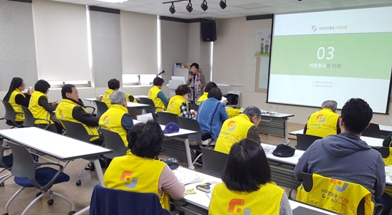 이날 교육에는 20여 명의 봉사자와 관계자들이 참석한 가운데 사회공헌활동 기부은행 사업소개, 자원봉사의 이해, 돌봄 활동 시 유의사항에 대한 강의 등으로 진행됐다. 사회공헌활동 기부은행 사업은 어르신 돌봄 봉사를 통해 얻은 봉사시간을 포인트로 적립해 만 65세 때 본인이 적립한 포인트를 사용하여 돌봄 봉사자를 부를 수 있는 제도로 가족이나 제삼자에게 기부할 수 있다.